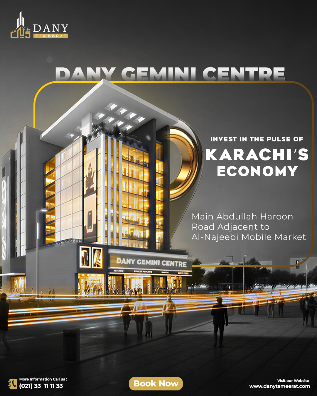 Dany Gemini Center on Main Abdullah Haroon Road, Karachi offers premium showrooms, smart warehousing, 24/7 security, and flexible payment plans. Invest in a modern commercial space designed for business growth. Contact us today!